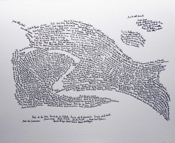 La parola ponte ha anche i significati di passaggio, via, dalla radice path- andare e di cammino, via, sentiero, dalla radice pad- pestare. Il ponte porta con sé il simbolismo della traversata e del passaggio rituale, la necessità di superare i propri limiti e confrontarsi con l’ignoto. Collegamento tra due realtà non comunicanti tra loro per vie normali, il ponte è una possibilità di avvicinamento tra opposte sponde, esperienza di incontro con l’altro, di comunicazione e di unione. Congiunzione di opposti, dicotomia tra stabilità e transitorietà, equilibrio tra staticità e provvisorietà. Ponte stradale, ponte ferroviario, ponte di ferro, ponte di legno, ponte di cemento armato, ponte fluviale, ponte marittimo, ponte provvisorio, ponte di chiatte, ponte di barche, ponte di zattere, ponte amovibile, ponte arcuato, ponte volante, ponte sospeso, ponte girevole, ponte mobile, arcobaleno. A proposito dell’acqua e dei suoi attraversamenti, una mappa di Venezia e dei ponti che la città contiene. Molte altre città sono ricche di ponti: Amsterdam, San Pietroburgo, Amburgo. Questo progetto prosegue con la rappresentazione di altre mappe. About water and its crossings, Venice is a city of water and bridges. Bridge came from Latin pŏnte is defined as an architectural structure that allows the passage from one bank to another of a water course, or the overcoming of a depression of the ground, thus allowing the crossing of obstacles along the road. The project born in this city. The word bridge also has the meanings of passing, from the root path- to go and from the root pad- step on. The bridge carries the symbolism of crossing and of ritual passage, the need to overcome limits and discover the unknown. Linking two realities that don't communicate with each other in normal ways, the bridge is a possibility of rapprochement between opposing shores, experience of meeting with others, of communication and union. Conjunction of opposites, dichotomy between stability and transience, balance between static and provisional. Road bridge, railway bridge, iron bridge, wooden bridge, reinforced concrete bridge, river bridge, maritime bridge, temporary bridge, barge bridge, boat bridge, raft bridge, removable bridge, arched bridge, flying bridge, bridge suspended, revolving bridge, drawbridge, rainbow. About the water and its crossings, a map of Venice and the bridges that the city contains. Many other cities are brimming with bridges: Amsterdam, St. Petersburg, Hamburg. This project will grow up with other maps.